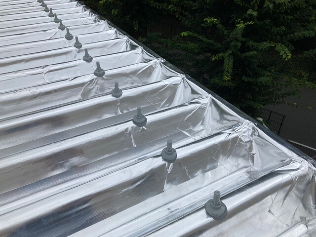 例えば、折板屋根用の遮熱シート「サーモバリア」のスカイ工法は、遮熱対策と雨漏りの改善が可能です。